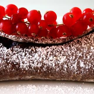 Spolverare con zucchero a velo e aggiungere un rametto di ribes per decorare.