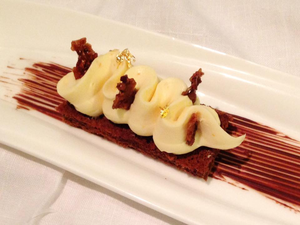Adagiate sul decoro un rettangolo di tenerina, decoratene la superficie con il cremoso al mandarino ( per fare questo usate un sac à poche con bocchetta da Saint Honorè), infine completate il tutto con frammenti di croccante e oro in fogli.