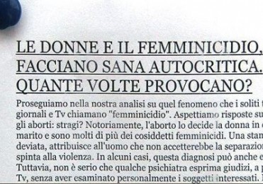 Il documento è un estratto dalla lettera apostolica “Mulieris dignitatem” commentata dall’editorialista del sito Pontifex.it, dal titolo “Donne e il femminicidio facciano sana autocritica. Quante volte provocano?”.