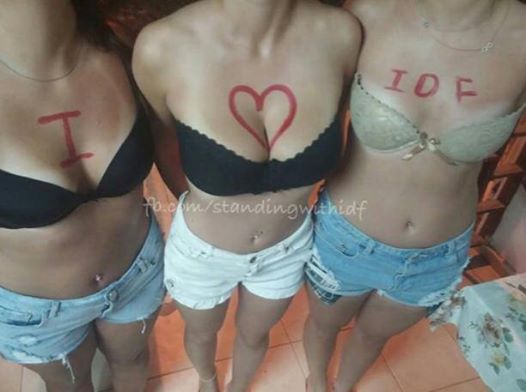 “Quelle scritte a colori sulla pelle We <3 IDF e i cuori rossi disegnati sul seno e sui glutei sono un sostegno alle Israel Defense Forces”.