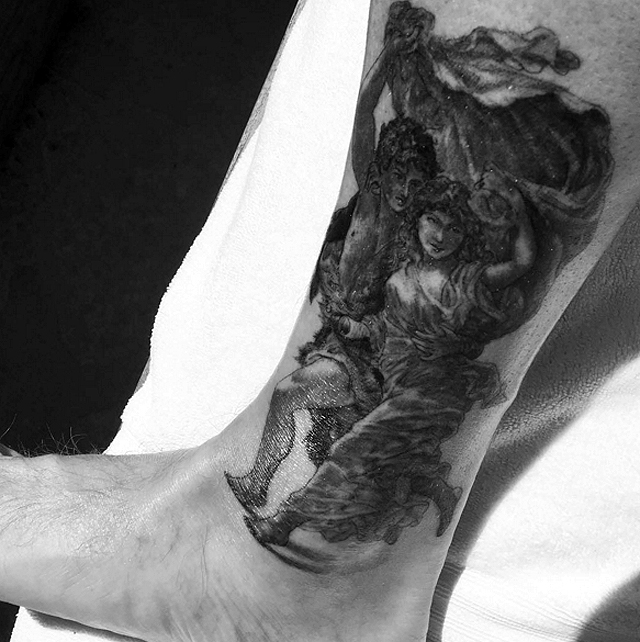 Il disegno sembra rappresentare un angelo maschio ed uno femmina, che corrono abbracciati. “Un bel nuovo tatuaggio di Mark Mahoney fatto allo Shamrock – scrive David Beckham – E’ sempre bello sedersi e fare conversazione per 5 ore mentre lo guardo lavorare… E’ un artista vero”.