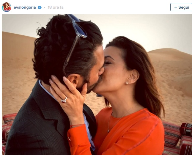DUBAI – Eva Longoria si sposa, per la seconda volta. La ex attrice di Desperate Housewives ha annunciato la bella notizia su Instagram dove il suo profilo è seguito da quasi due milioni di persone. L’attrice, 40 anni, domenica ha postato una foto in cui bacia il fidanzato Josè Antonio Baston nel deserto di Dubai. All’anulare sinistro un rubino contornato da diamanti. E la didascalia: “So this happened. #engaged #dubai #happiness”.