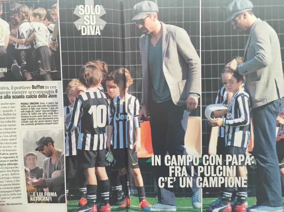 TORINO – Gigi Buffon alla scuola calcio della Juve, insieme al figlio Louis Thomas, 7 anni,che sulla maglia dei “pulcini” bianconeri sfoggia il numero 10. Il calciatore, padre anche di David Lee, 5 anni, viene letteralmente preso d’assalto dai piccoli fan.