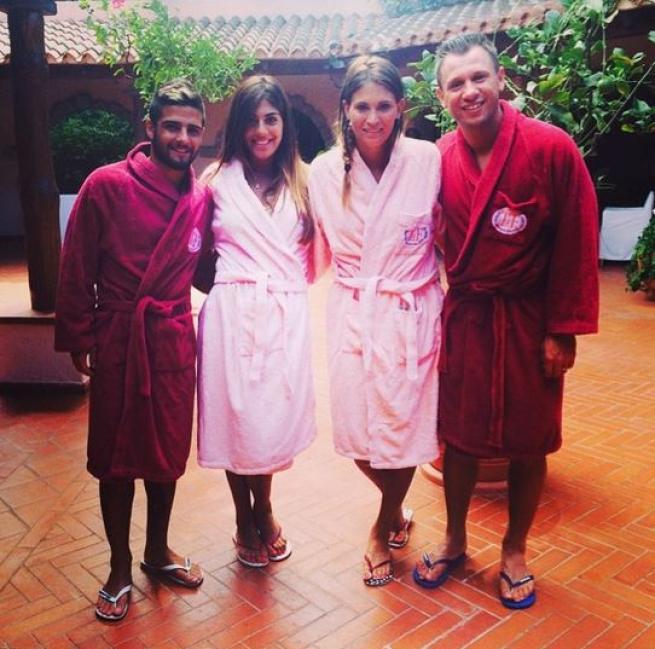 Con lui anche Lorenzo Insigne, calciatore azzurro, con la moglie e il figlio, ma nello stesso resort in queste settimane sono passati parecchi calciatori: Alberto Aquilani, che anche lui ha festeggiato i 30 anni al mare, con la moglie Michela Quattrociocche, Antonio Nocerino, Claudio Marchisio con le rispettive famiglie…