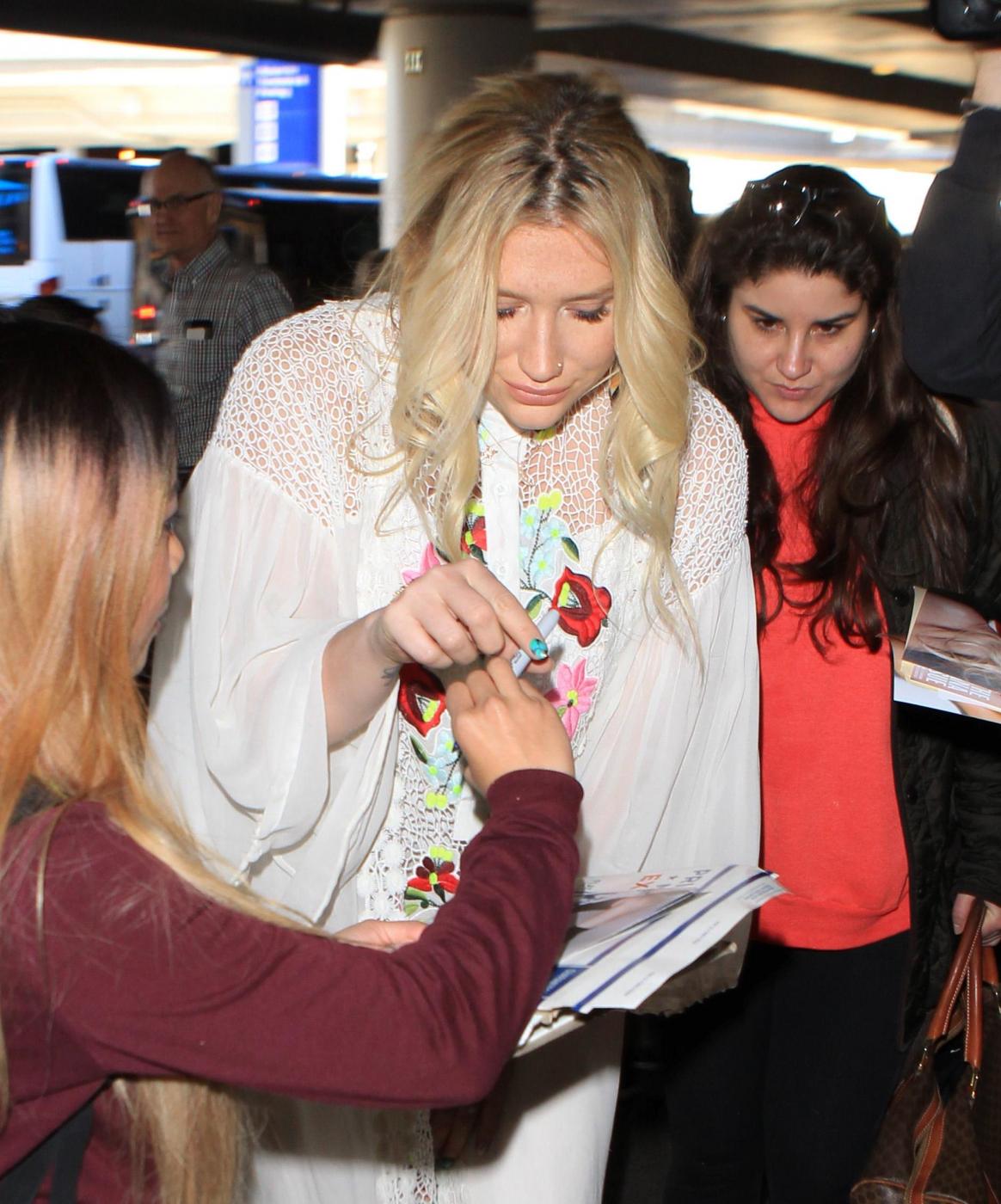 LOS ANGELES – Kesha firma autografi in aeroporto indossando una lunga tunica bianca. La cantante è stata paparazzata così all’aeroporto di Los Angeles ed ha rischiato di perdere l’aereo su cui doveva viaggiare a causa di un sacchetto sospetto rivelatosi poi un falso allarme, che ha richiesto l’intervento degli artificieri.