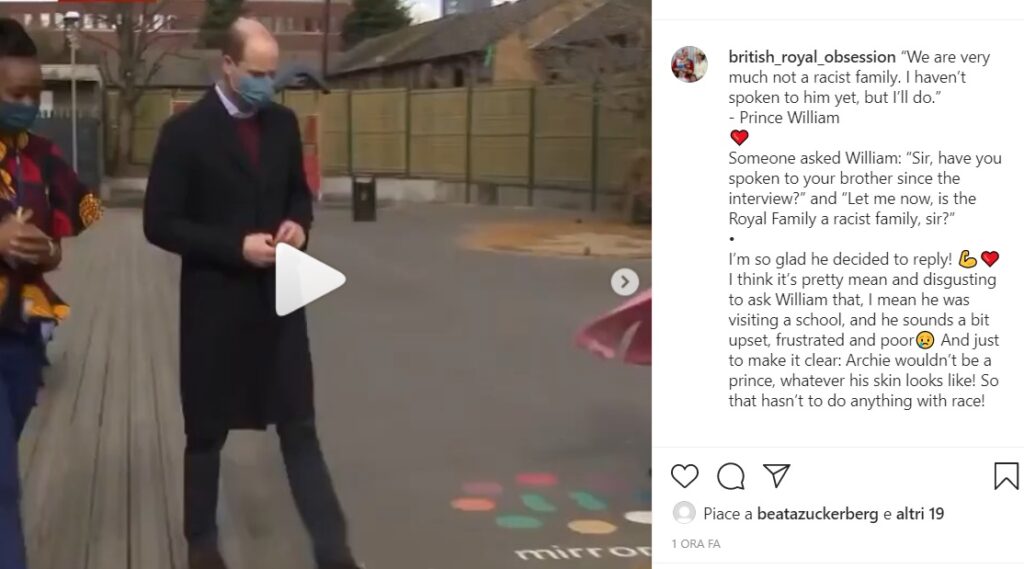 Durante l’evento, al principe William sono toccate molte domande dei reporter, uno dei quali gli ha chiesto senza mezzi termini: “La famiglia reale è razzista, signore?”.