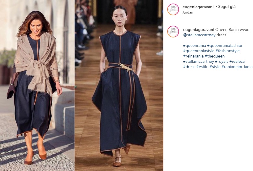 Rania tendenzialmente predilige outfit piuttosto classici, ma non raramente ama sfoggiare capi degli stilisti più innovativi in circolazione e Stella McCartney è una di loro.
