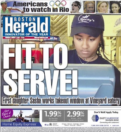 Secondo il Boston Herald, Sasha – che a lavoro si fa chiamare col nome per esteso, Natasha – svolge le mansioni di una comune cameriera: fa il conto in cassa, serve i clienti e pulisce il locale prima e dopo il lavoro. A rivelarlo è un collega della ragazza, che ha aggiunto di non averla riconosciuta inizialmente e di essersi meravigliato delle attenzioni che i superiori le rivolgevano nei primi giorni, quando Sasha aveva tutto da imparare. Secondo il quotidiano di Boston, la figlia di Obama sarebbe controllata a vista da alcuni agenti segreti, che durante il suo orario lavorativo la aspetterebbero chiusi in un SUV. Ma la famiglia del presidente conosce bene l’ambiente che si respira al Nancy’s, così come i proprietari del locale, visto che si tratta di una tappa fissa nei loro viaggi a Martha’s Vineyard. L’esperienza lavorativa di Sasha, ad ogni modo, non è destinata a durare per molto: dovrebbe terminare già il prossimo sabato – come conferma un’altra collega della ragazza -, quando i genitori la raggiungeranno sull’isola per godersi una vacanza di 2 settimane. “Cerchiamo di rendere la vita delle nostre figlie più normale possibile” ha dichiarato la first lady Michelle Obama al programma televisivo Entertainment Tonight solo poche ore fa, e del resto questa “normalizzazione” ha suscitato diverse polemiche nelle file dei sostenitori del marito, in particolar modo quando la primogenita Malia ha preferito partecipare al festival musicale Lollapalooza invece di presenziare alla convention democratica. Gli Obama però proseguono dritti per la loro strada, tentando di non far sentire le loro figlie né speciali né diverse dal resto del mondo. E far lavorare la secondogenita come cameriera è un modo per riuscirci.