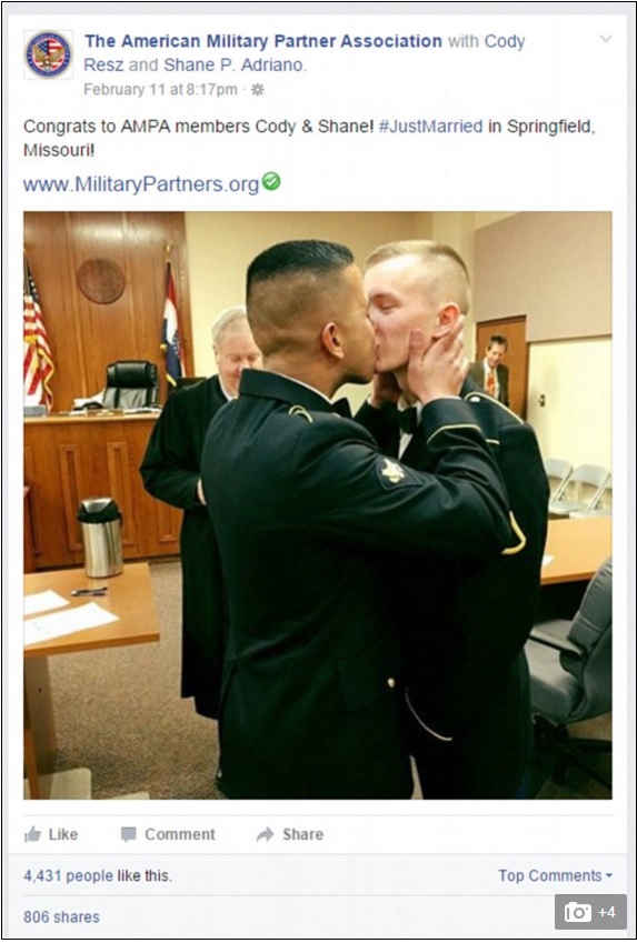 “(…)quello che sarebbe dovuto essere un “affare privato” è diventato (…) un evento collettivo che ha coinvolto decine di migliaia di americani. La foto del loro primo – e appassionato – bacio da neo-sposi, infatti, è stata pubblicata sulla pagina Facebook dell’American Military Partner Association, l’associazione che – come si legge sul loro sito – “rappresenta e sostiene le famiglie militari moderne”, le famiglie arcobaleno in cui uno, o (come in questo caso) entrambi i partner, vestono l’uniforme e difendono ogni giorno la bandiera degli Stati Uniti”.