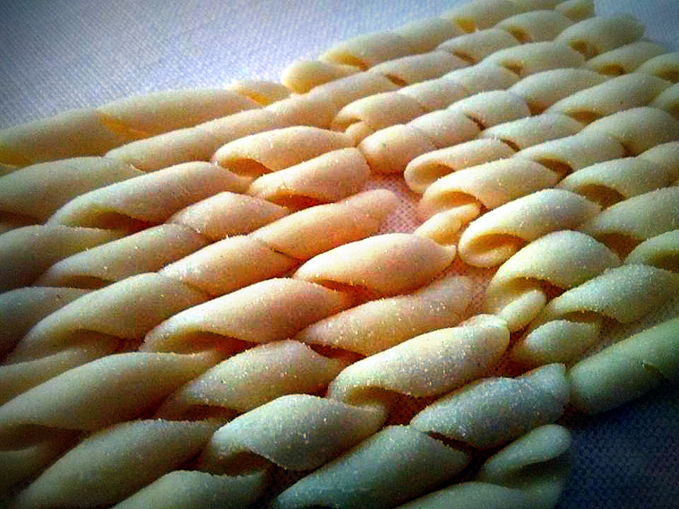 Cominciare a fare i fusilli, prendere il ferro adatto, poggiarlo con delicatezza sul filoncino e con movimento deciso ma senza premere molto formare il fusillo, tutto in un unico movimento (senza andare avanti e indietro e senza mettere la mano sul fusillo che si sta lavorando), sfilare il fusillo dal ferro e metterlo sul canovaccio, man mano che si formano metterli l’uno accanto all’altro lasciando un leggero spazio.