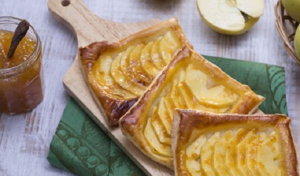 Ingredienti: 2 mele gialle, 320 grammi di pasta sfoglia, un tuorlo, 30 grammi di acqua, 70 grammi di confettura di pesche