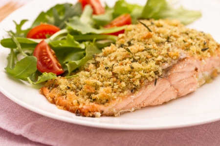ROMA – Un modo gustoso di preparare un classico filetto di salmone. Panato con pane raffermo e erbe aromatiche, il salmone croccante viene cotto in forno.