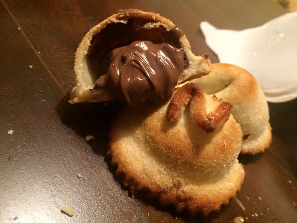 Mettere al centro il ripieno preparato ( in alternativa Nutella), inumidire leggermente e chiudere dando la forma di tortelli.