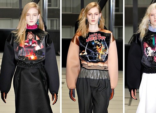 Pantaloni a vita alta, grandi volumi e abiti con giochi di sovrapposizioni e trasparenze, il tutto abbinato a inserti di tessuti metallici quali argento e bronzo. Il capospalla per eccellenza è indubbiamente il trench, rigorosamente con ampi risvolti e dai colori a contrasto come il blu elettrico sul grigio.