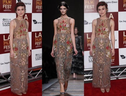 Per l’occasione l’attrice inglese ha scelto un abito Valentino Fall 2012 in tulle ricamato con dettagli floreali colorati.Per dare ancora più enfasi al vestito, ha aggiunto ai capelli dei petali di rosa rosso fuoco così da rievocare atmosfere greche dal sapore mitologico.
