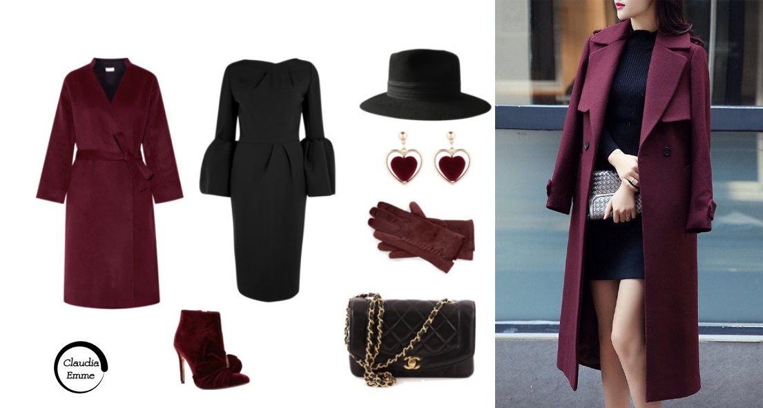 Il look di oggi è estremamente semplice ma al tempo stesso molto fashion. Inizia partendo da un semplicissimo tubino nero, che sicuramente avrai nell’armadio. Quello scelto da noi ha le maniche lunghe a sbuffo ed è firmato ROKSANDA ma qualsiasi altro tipo di tubino nero è adatto per l’outfit del giorno. Una volta indossato il black dress giusto il gioco è fatto! Abbina un caldo cappotto color burgundy. Perfetto il modello a vestaglia con cintura in vita, vero must have di stagione, come quello di PAUL & JOE scelto da noi. Aggiungi un tronchetto velvet burgundy, come quello super chic di Ted Baker London adesso in saldo ad 83 sterline. Borsa Chanel vintage, guantini burgundy in suade, cappello in stile retrò modello Audrey e orecchini burgundy, il gioco è fatto! Siete pronte per una nuova giornata di lavoro super glamour!