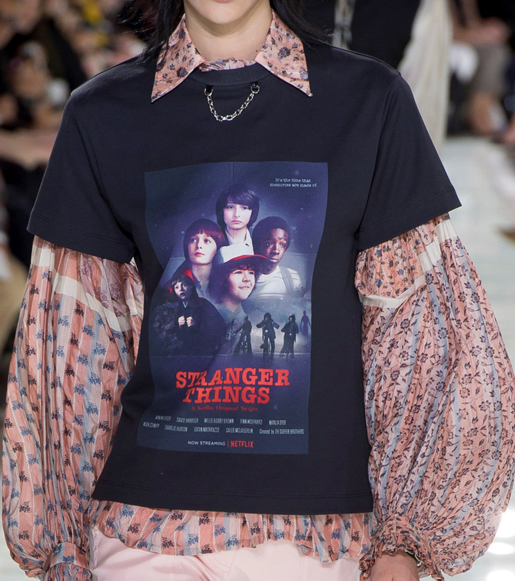 Scostumista– Con Mad Man sono stati gli anni ’50 e ’60 a influenzare il mondo fashionista; linee a corolla o tubini a sacchetto furono ripresi dagli stilisti qualche stagione fa, tanto che la costumista Janie Bryant fu corteggiata da grossi brand come Banana Republic per disegnare una linea ispirata alla fortunata serie televisiva. Il declino della disco e il sorgere della cultura hip hop nella New York di fine anni ’70 è l’ambientazione della serie Netflix “The Get Down” diretta da Baz Luhrmann ed è stata fonte d’ispirazione per Pierpaolo Piccioli per la collezione Cruise 2018 di Valentino. Con Stranger Things, altra seguitissima serie Netflix, sono gli anni ’80 a far impazzire il mondo della moda. Nella immaginaria piccola città dell’Indiana un gruppo di ragazzini indaga sulla misteriosa scomparsa di un loro amico con l’aiuto di una a bambina dotata di particolari poteri psichici fuggita da un laboratorio segreto. Girano in bicicletta come Elliot (il protagonista di E.T. l’extraterrestre e come lui giocano a Dungeons&Dragons), indossano felpe, jeans, cappellini con visiera, giubbini in denim con collo di pelliccia ecologica, occhiali oversize, polo a righe, calzini da tennis e sneakers. E proprio il marchio Reebok che negli anni ’80 andava tantissimo, ha lanciato un’edizione speciale di scarpe dalla linea vintage con la grafica ispirata a Ghostbusters personalizzata sulle scarpe, completa di suole ingiallite e loghi Reebok originali (nella seconda puntata della seconda stagione i ragazzi si travestono da Ghostbusters per Halloween), Dustin Henderson, interpretato da Gaten Matarazzo nella serie, è noto per essere un grande fan del film del 1984, e il modello Reebok Ex-O-Fit Clean Hi ha i disegni di Dustin su ciascun lato delle scarpe. La povera Barb interpretata da Shannon Purser, nonostante le poche apparizioni nella serie, trova giustizia con il sorprendente interessamento dei fans (l’hashtag #justiceforbarb è stato un vero trend nei social media) e con un libro di citazioni, consigli di vita e illustrazioni che il brand britannico Top Shop dedica a lei e alla serie, insieme ad altri accessori come zaini e cappellini. Sembra inoltre che il direttore creativo di Louis Vuitton, Nicolas Ghesquière, sia altrettanto entusiasta della seconda stagione di Stranger Things come lo sono i fan e per l’estate 2018 fa indossare alla modella Sora Choi una t-shirt nera con sopra la stampa del cast su una romantica camicia rosa dalle maniche a sbuffo. Mentre Raf Simmons, direttore creativo di Calvin Klein, per lanciare la nuova linea Calvin Klein By Appointment, sceglie l’attrice tredicenne Millie Bobby Brown (Eleven nella serie) che nel frattempo è diventata una vera e propria trendsetter dei red carpet. La seconda stagione si chiude con l’attesissimo Ballo d’Inverno e sulle note di Time After Time di Cindy Lauper ed Every Breath You Take dei Police si balla indossando ampi abiti di taffeta, camicie con grossi colli, rouches e maniche a sbuffo, gilet di maglia e papillon, e i capelli sono cotonatissimi e stilizzati con l’aiuto della lacca Farrah Fawcett. di Annapaola Brancia d’Apricena
