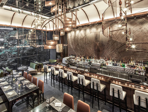 Gli interni un po’ surreali con una forte presenza di parti metalliche in riferimento alla storia dell’edificio, sono stati ispirati in parte al film Alphaville, un classico del 1965 con la regia di Jean Luc Godard, che esplora le connessioni tra società, arte e tecnologia. (Esempio: i tre lampadari in tubo di rame a forma di scale a chiocciola, un tema ricorrente nel film)