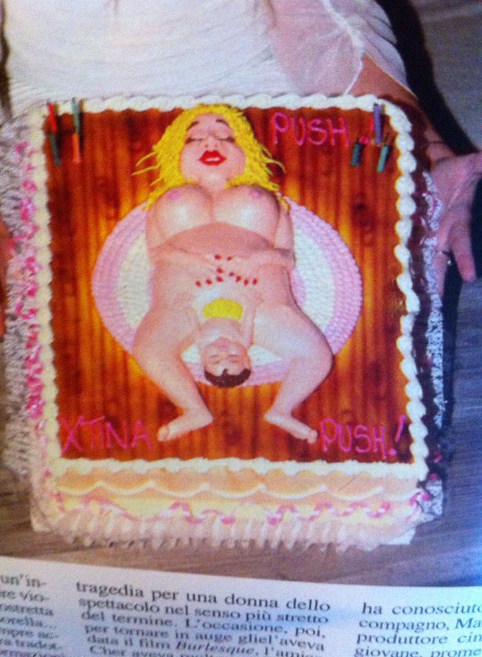 USA – Christina Aguilera ha organizzato un party a pochi giorni dalla nascita di sua figlia. Per l’occasione la cantante ha scelto una torta decisamente trash: è decorata con una donna che sta per partorire. Non solo: si vede anche il bebè che sta per uscire dalla vagina della donna. Insomma, neanche il “boss delle torte” sarebbe mai arrivato a questo punto. “Ok, questa è la torta più folle che abbia mai visto”, dice lei. In effetti, come darle torto? Quello di Cristina è stato il classico “baby shower”, ovvero un party fra amici che si organizza a pochi giorni dal parto.