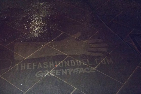 Nel corso della notte tra il 18 e il 19 febbraio, una squadra di attivisti di Greenpeace ha costellato i marciapiedi del quadrilatero della moda con le immagini della campagna “The Fashion Duel” e il messaggio “Let’s clean up fashion”, chiedi alla moda di ripulirsi, utilizzando la tecnica dei “clean graffiti” che, rimuovendo lo sporco dalle superfici, crea immagini e messaggi temporanei su strade e marciapiedi.