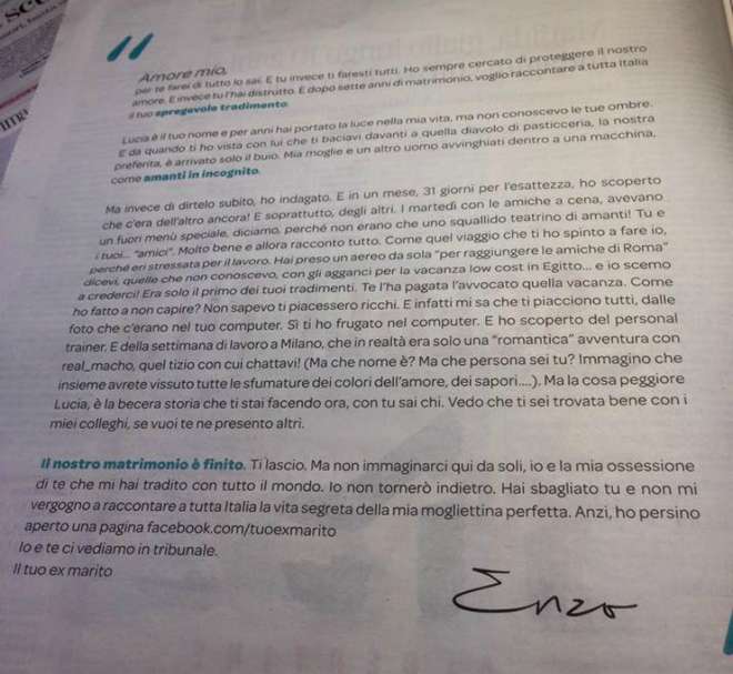 “Il nostro matrimonio – scrive Enzo a fine lettera – è finito. Ti lascio. Ma non immaginarci qui da soli, io e la mia ossessione di te che mi hai tradito con tutto il mondo. Io non tornerò indietro. Hai sbagliato tu e non mi vergogno a raccontare a tutta Italia la vita segreta della mia mogliettina perfetta. Anzi, ho persino aperto una pagina facebook. Io e te ci vediamo in tribunale. Il tuo ex marito”