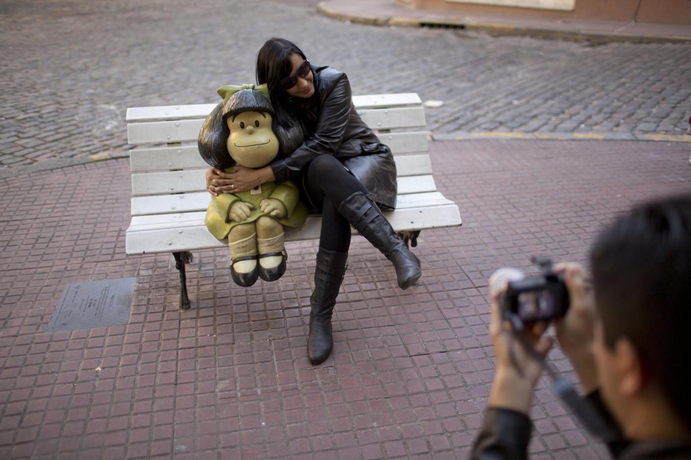 A tourist sits on a bench beside the statue of comic strip characeter Mafalda in Buenos Aires, Argentina, Monday, Sept. 15, 2014. Argentine cartoonist Joaquin Salvador Lavado, better known as Quino is the creator of the comic strip Mafalda , that will celebrate 50 years since its first appearance on September 1964. (AP Photo/Natacha Pisarenko)