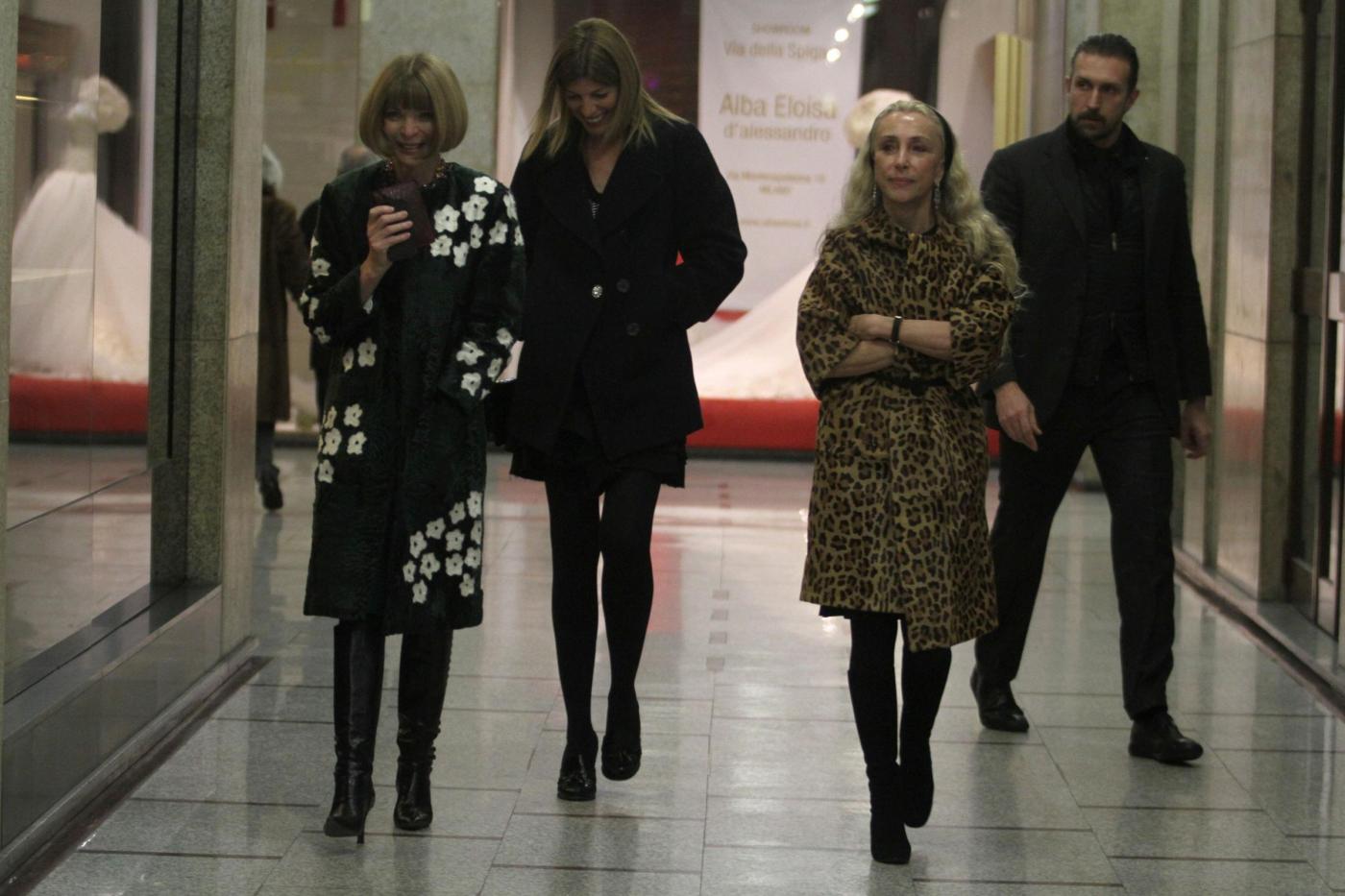 Le due severe critiche stanno seguendo in questi giorni la settimana della moda milanese dopo aver preso parte alle precedenti fashion week tra Londra e New York. Durante una tranquilla passeggiata in Via Monte Napoleone, la Wintour viene fotografata con un cappottino scuro impreziosito da disegni floreali. La collega italiana opta invece per un maxi cappotto animalier e una larga fascia nera tra i capelli (foto LaPresse)