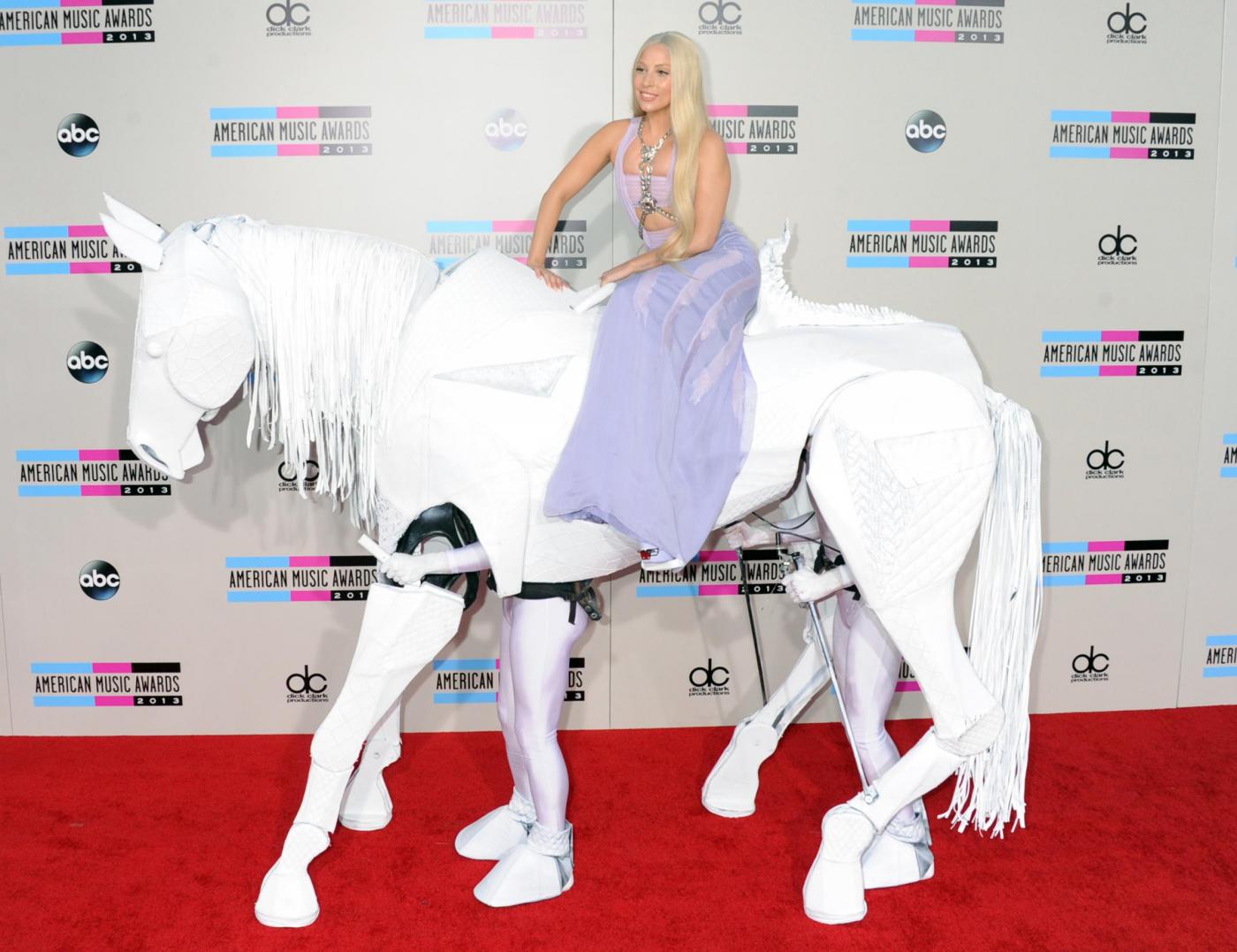 LOS ANGELES – Prima di trasformarsi in Marilyn Monroe per uno show “presidenziale” con R.Kelly, Lady Gaga arriva sul red carpet dei 41esimi American Music Awards di Los Angeles, in groppa a un cavallo bianco.