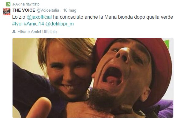 ROMA – Maria De Filippi “strozza” J-Ax: il simpatico selfie è stato postato sulla pagina Twitter di The Voice of Italy dopo la partecipazione del rapper, in qualità di ospite, al talet show di canale 5. Lo scatto mostra Alessandro Aleotti, questo il suo vero nome, mentre la regina degli ascolti della televisione italiana lo strangola simpaticamente.