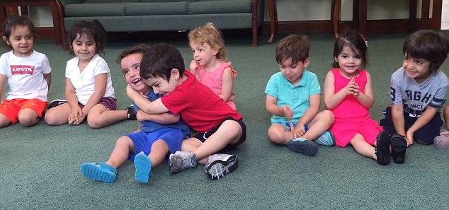 A stimolare la risata collettiva è il bimbo vestito di blu, quello che si vede in primo piano. L’insegnate Sara Shonfeld racconta che il bimbo ride grazie all’effetto che fa su di lui la canzone scelta. “Batti le mani e poi fermati” è il gioco messo in scena dall’insegnate che in questo modo vuole spiegare ai piccoli una forma di apprendimento basata sull’espressività musicale.