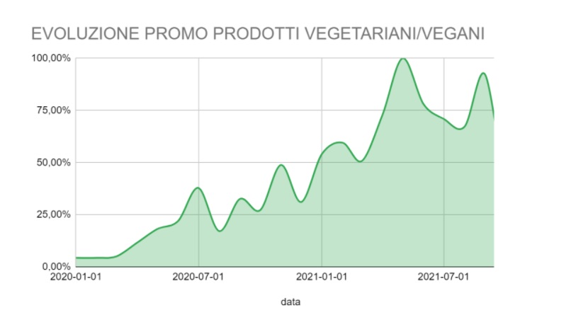 L’analisi si basa sull’intervallo di dati da gennaio 2020 a settembre 2021. Il grafico mostra chiaramente il cambio di scenario a cui stiamo assistendo. Mettendo a confronto ad esempio settembre 2020 e settembre 2021, la crescita di promo di prodotti vegetariani e vegani è del 182%.