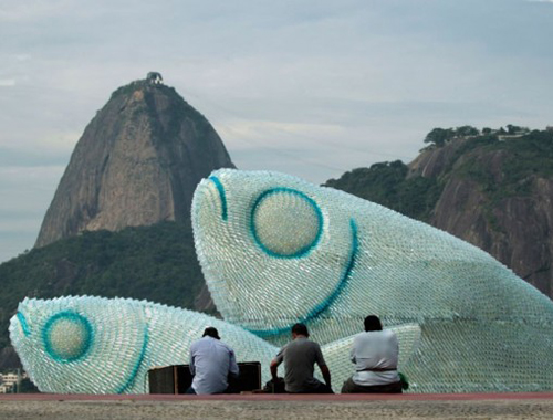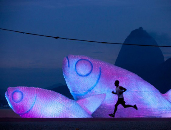 RIO DE JANEIRO – Troneggia tra le immagini più significative della settimana, sul sito del noto quotidiano francese Le Figaro, ma non si tratta dell’istantanea di un avvenimento d’attualità, bensì di una non poco trascurabile istallazione, che da bella mostra di sé nello splendido scenario di Botafogo beach, a Rio de Janeiro. A prima vista sembrerebbero semplicemente tre enormi pesci, che si stagliano sule colline che fanno loro da sfondo, ma a ben vedere c’è un messaggio, neanche troppo nascosto, nella loro particolare composizione.