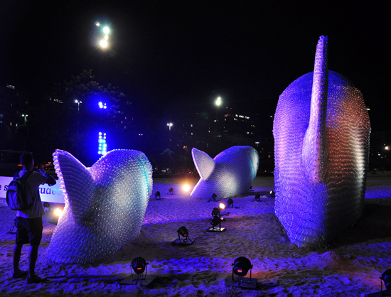 Perchè la triplice scultura è costituita da un nutrito insieme di bottiglie di plastica che, oltre a riprodurre in maniera eccellente i riflessi del sole che luccicano effettivamente sulle scaglie degli animali in carne e pinne (e della luce artificiale nel buio della notte), attirano l’attenzione sullo spreco di risorse. E tutto ciò proprio nella città che ospita l’Earth Summit 2012 sullo sviluppo sostenibile inaugurato il 20 giugno, che riunisce, sotto l’egida dell’ONU, un centinaio di capi di governo e una consistente delegazione africana, e dal quale dovrebbero venir fuori le linee guida di una politica condivisa sui temi dell’ambiente.