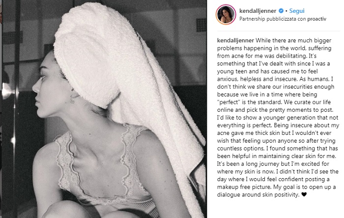 Il messaggio lungo e toccante postato su Instagram è stato sponsorizzato da Proactiv. Ecco cosa ha scritto: “Ci sono problemi molto più grandi che accadono nel mondo, ma soffrire di acne per me è stato debilitante. È qualcosa che ho affrontato quando ero una giovane adolescente e mi ha fatto sentire ansiosa, impotente e insicura. Noi umani non pensiamo e condividiamo abbastanza le nostre insicurezze perché viviamo in un tempo in cui essere ‘perfetti’ è lo standard. Curiamo la nostra vita pubblicando online solo i momenti più belli. Mi piacerebbe mostrare una generazione che non è tutta perfetta(…)”.