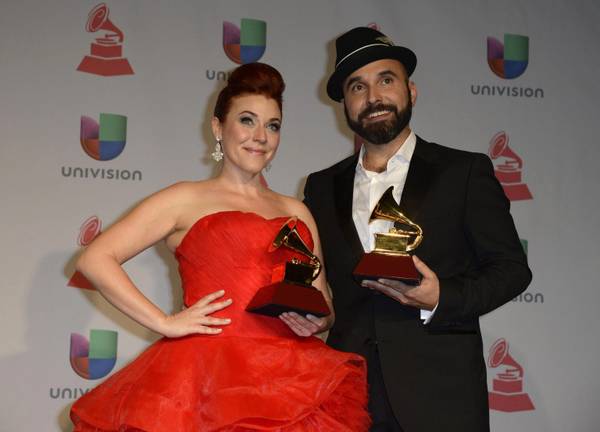Alisha Gaddis e Lucky Diazepa03960201 Musicians Alisha Gaddis (L) and Lucky Diaz of Lucky Diaz y La Familia Musica hold their award for Best Latin Children's Album in the press room during the 14th Annual Latin Grammy Awards Ceremony at the Mandalay Bay Resort and Casino in Las Vegas, Nevada, USA, 21 November 2013. EPA/MICHAEL NELSON