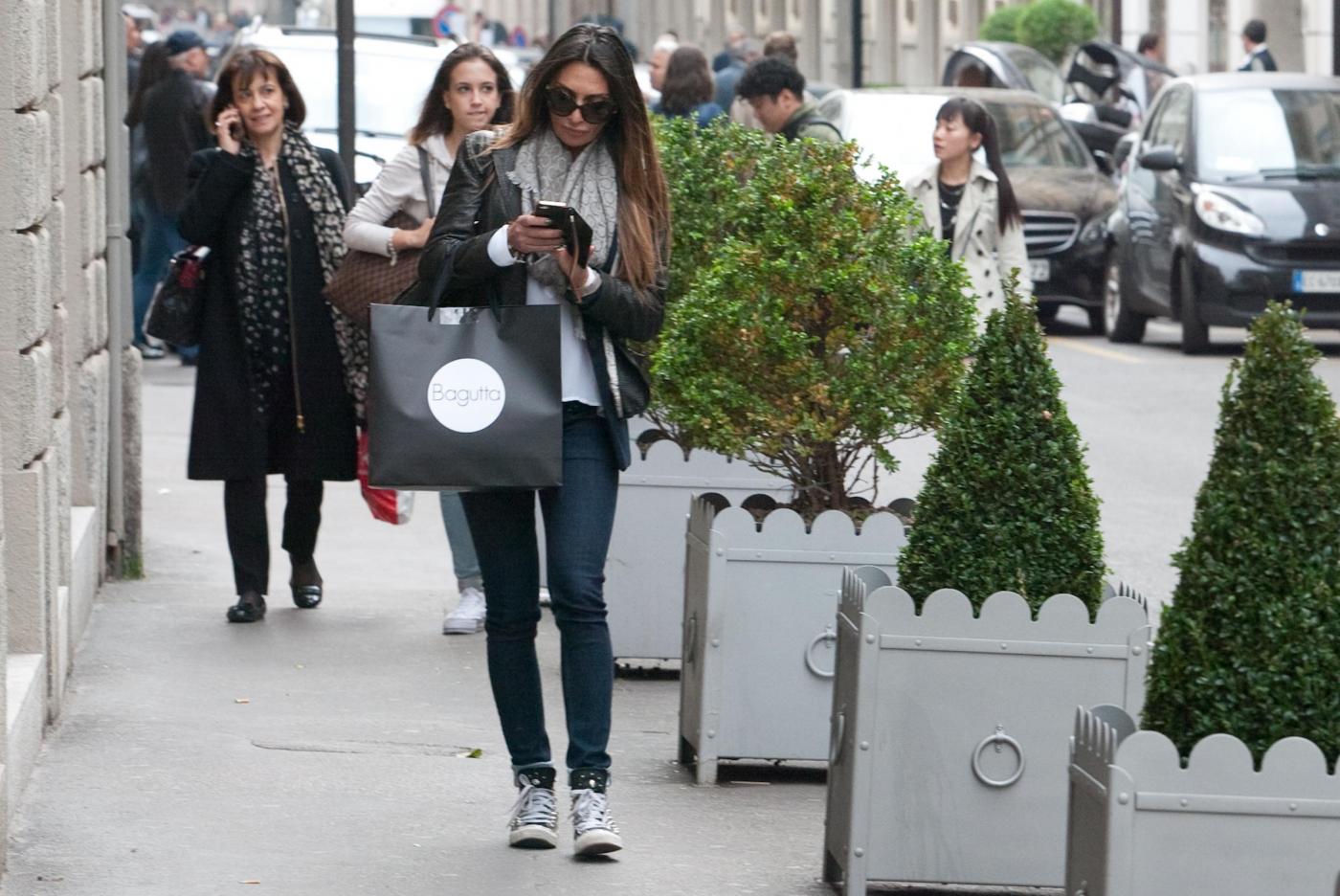 Per muoversi a Milano, invece, non usa più i taxi bensì i mezzi pubblici. C’è da crederle? Intanto la vediamo per via Montenapoleone in scarpe da ginnastica e occhialoni da sole. Non passa comunque inosservata. E gli obiettivi la immortalano mentre passeggia a passo svelto parlando al telefonino fino a che incontra un amico con cui aveva un appuntamento. D’altra parte l’aveva detto anche lei “riesco a mantenermi bella e in forma grazie a lunghe passeggiate e alle pulizie di casa” (foto LaPresse)