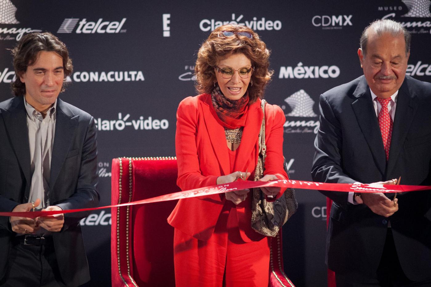 MEXICO Mexico City, Sept. 19, 2014 Italian actress Sophia Loren (C), cuts the ribbon with Mexican businessman Carlos Slim Helu (R), during the inauguration of an exhibition held in her honor at the Soumaya Museum in Mexico City, capital of Mexico, Sept. 18, 2014. Loren is in Mexico to celebrate her 80th birthday and participate in a variety of events, according to local press.Zuma press/LaPresseOnly Italy