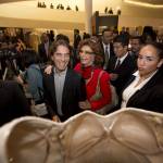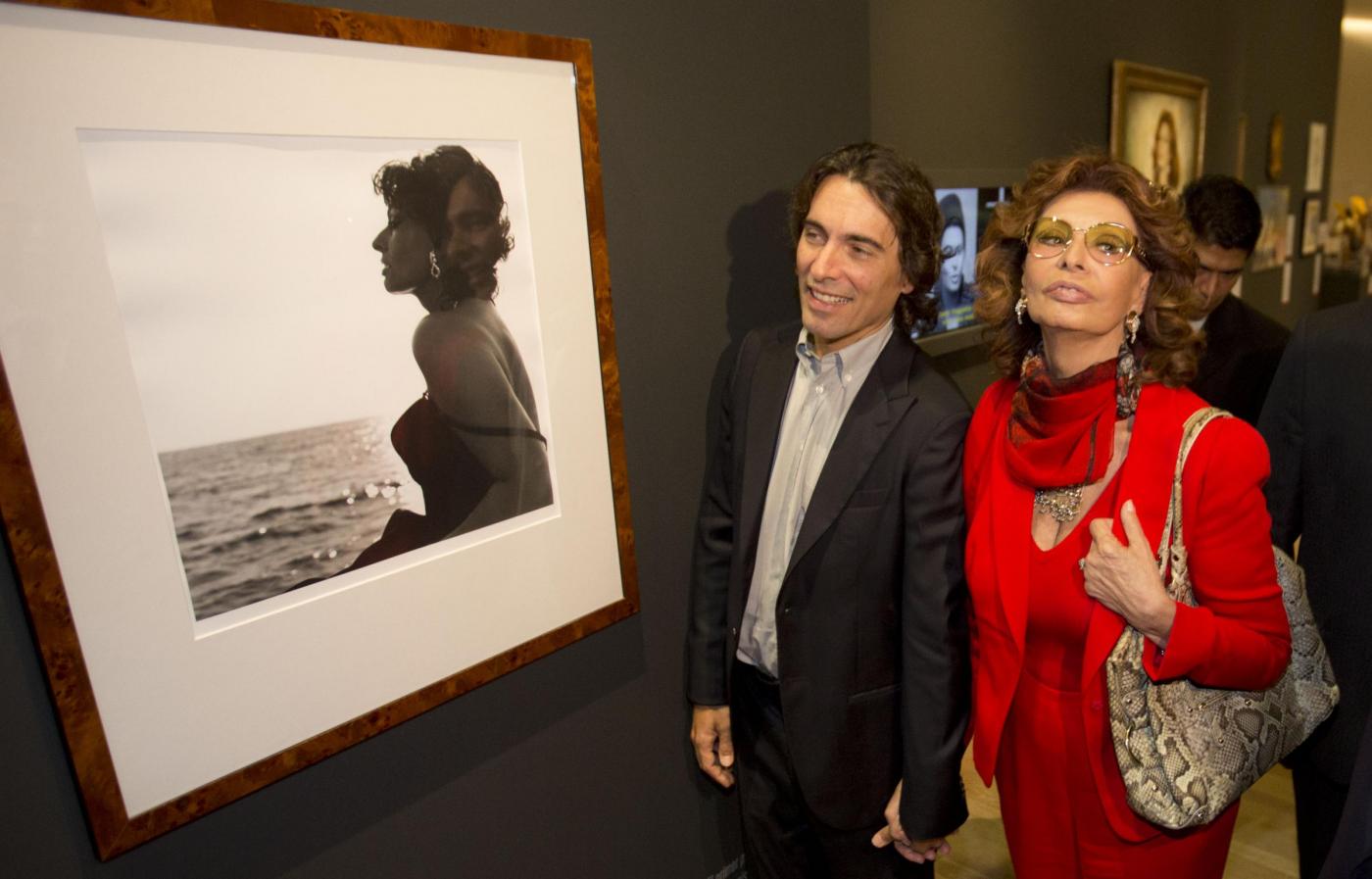 Italy's actress Sophia Loren and her son Carlo Ponti attend an exhibit about Lorn's life and work inside the Soumaya art museum in Mexico City, Thursday, Sept. 18, 2014. Loren traveled to Mexico to attend the exhibit that shows off her wardrobe, photographs, books and memorabilia in commemoration of her 80th birthday this Saturday, Sept. 20. (AP Photo/Eduardo Verdugo)