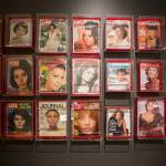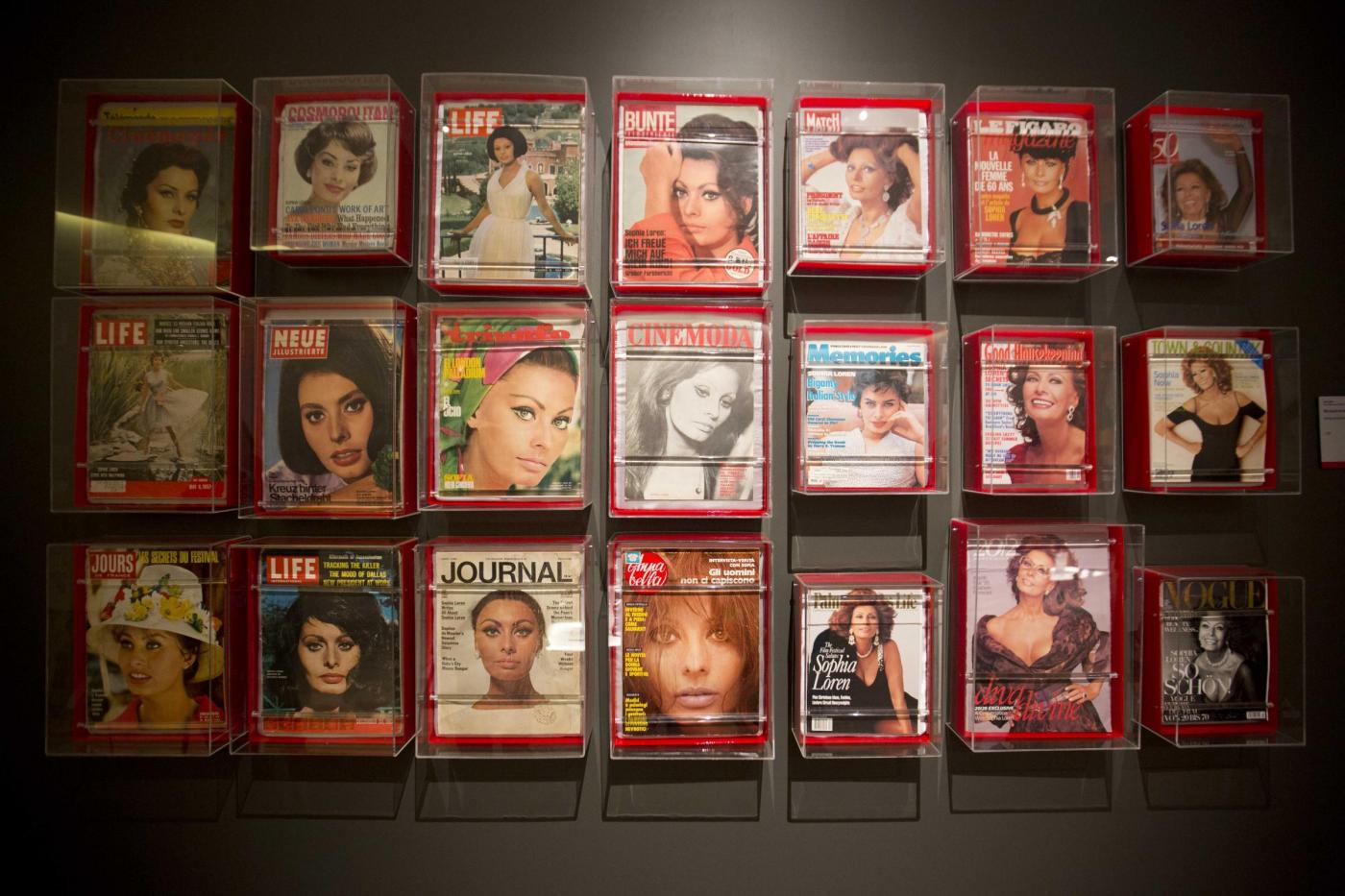 Magazine covers featuring Italy's actress Sophia Loren are displayed at the Soumaya art museum in Mexico City, Thursday Sept. 18, 2014. Loren traveled to Mexico to attend the exhibit about her life and work, in commemoration of her 80th birthday this Saturday, Sept. 20. (AP Photo/Eduardo Verdugo)