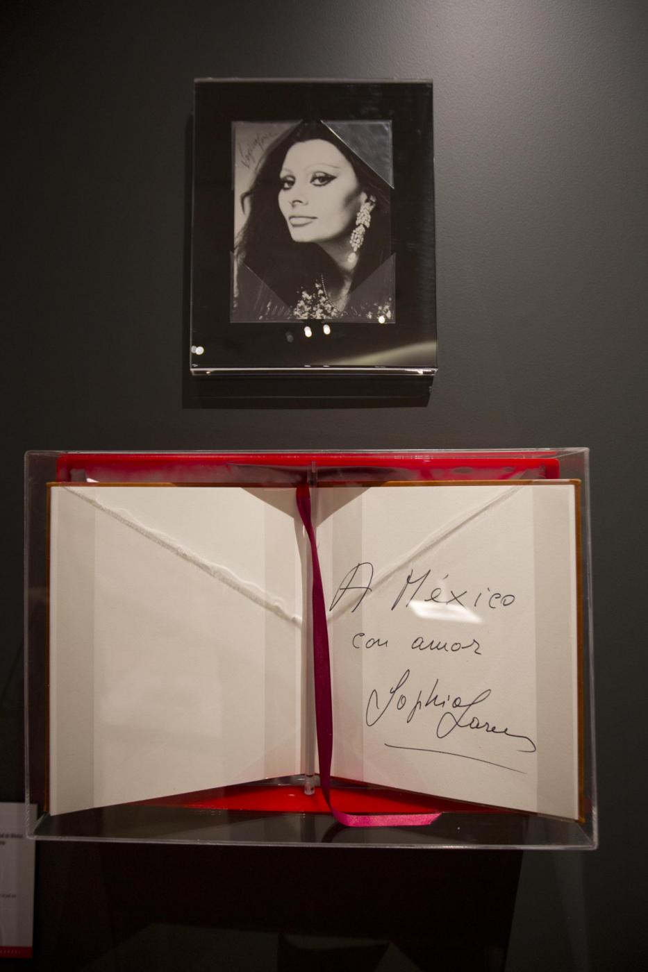 A photograph of Sophia Loren and a note written by her reading in Spanish "To Mexico with Love, Sophia Loren" are displayed as part of an exhibit at the Soumaya art museum in Mexico City, Thursday, Sept. 18 2014. Loren is in Mexico for an exhibit about her life and work, in commemoration of her 80th birthday this Saturday, Sept. 20. (AP Photo/Eduardo Verdugo)
