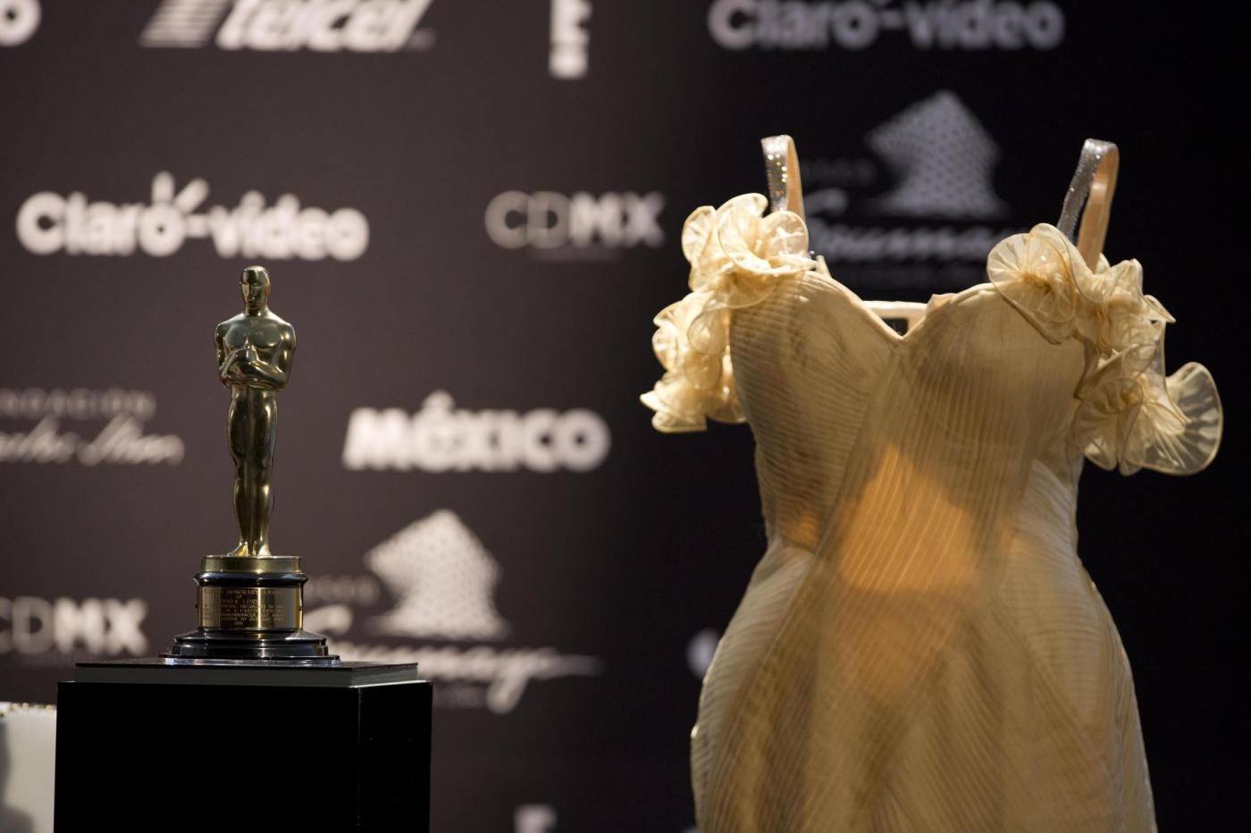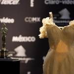 An Oscar statuette and dress worn by Italy's actress Sophia Loren are on exhibit at the Soumaya art museum in Mexico City, Thursday, Sept. 18, 2014. Loren traveled to Mexico to attend the exhibit that shows off her wardrobe, photographs, books and memorabilia in commemoration of her 80th birthday this Saturday, Sept. 20. (AP Photo/Eduardo Verdugo)