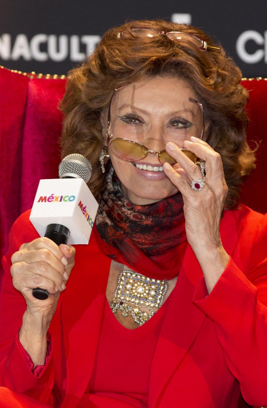 Italy's actress Sophia Loren adjusts her glasses during a press conference at the Soumaya art museum in Mexico City, Thursday, Sept. 18 2014. Loren is in Mexico for an exhibit about her life and work, in commemoration of her 80th birthday this Saturday, Sept. 20. (AP Photo/Eduardo Verdugo)