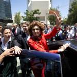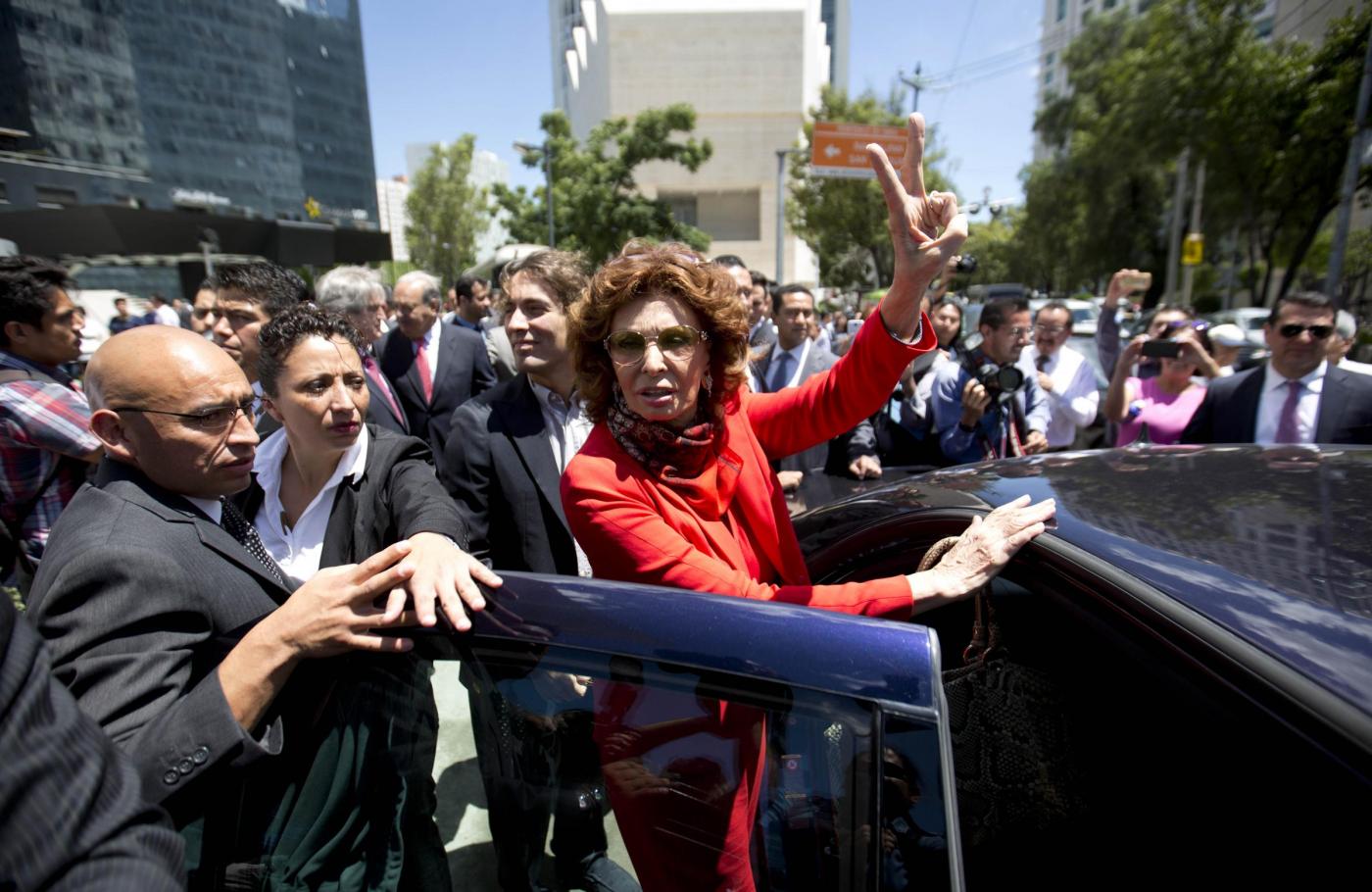 Italy's actress Sophia Loren waves to fans after making an appearance at the Soumaya art museum in Mexico City, Thursday, Sept. 18 2014. Loren is in Mexico for an exhibit about her life and work, in commemoration of her 80th birthday this Saturday, Sept. 20. (AP Photo/Eduardo Verdugo)