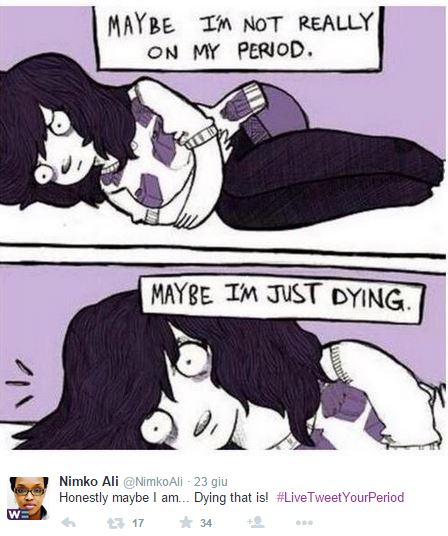 ROMA – “Come mi sento quando ho il ciclo”: donne si sfogano su Twitter grazie all’hashtag #livetweetyourperiod. Pianti improvvisi, nervosismi, senso di frustrazione, gonfiori e aumento della ritenzione idrica: questo e molto altro lamentano le rappresentanti del gentil sesso in riferimento ai giorni del ciclo mestruale.