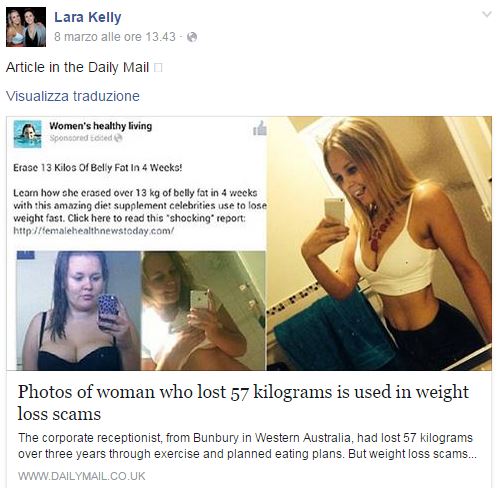 SIDNEY – Dieta, perde 57 kg. Senza saperlo, diventa testimonial prodotti dimagranti. Questa la dissavventura di una giovane australiana, Lara Kelly, 21 anni, dopo aver pubblicato su Instagram e Tumbl le foto che mostarvano i successi della sua cura dimagrante. Come spiega il DailyMail, la ragazza è dimagrita più di 50 chili.