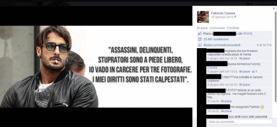 Fabrizio Corona è stato condannato per vari reati, tuttavia sembra che i suoi sostenitori ma anche la maggior parte degli utenti Facebook ritengano gli anni di carcere ingiusti e sproporzionati.