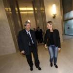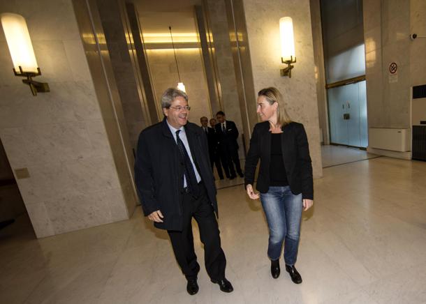 Il Ministro degli Esteri uscente, Federica Mogherini, accoglie il nuovo Ministro, Paolo Gentiloni, all'interno della Farnesina, 1 novembre 2014 a Roma, ANSA/MASSIMO PERCOSSI