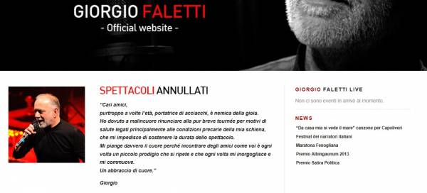 “Cari amici, l’età a volte è nemica della gioia” scriveva Giorgio Faletti, annunciando la cancellazione della sua tourneé. Cause di salute, scriveva l’attore. Faletti era malato da tempo ed evidentemente per lui era diventato insostenibile continuare i suoi spettacoli: