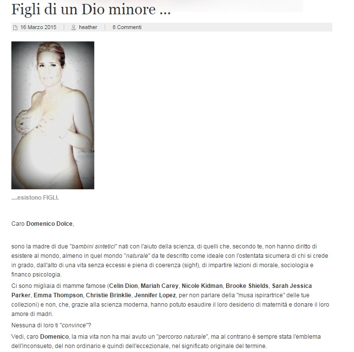 “Caro Domenico Dolce, sono la madre di due “bambini sintetici” nati con l’aiuto della scienza, di quelli che, secondo te, non hanno diritto di esistere al mondo, almeno in quel mondo “naturale” da te descritto come ideale con l’ostentata sicumera di chi si crede in grado, dall’alto di una vita senza eccessi e piena di coerenza (sigh!), di impartire lezioni di morale, sociologia e financo psicologia. Ci sono migliaia di mamme famose (Celin Dion, Mariah Carey, Nicole Kidman, Brooke Shields, Sarah Jessica Parker, Emma Thompson, Christie Brinklie, Jennifer Lopez, per non parlare della “musa ispiratrice” delle tue collezioni) e non, che, grazie alla scienza moderna, hanno potuto esaudire il loro desiderio di maternità e donare il loro amore di madri. Nessuna di loro ti “convince”?”.