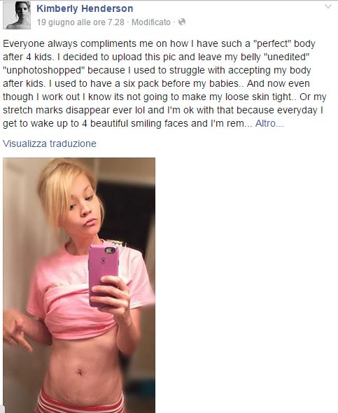 SOUTH CAROLINA (USA) – Kimberly Henderson: “Io mamma dal corpo perfetto? Macchè: ecco i segni della gravidanza. Kimberly è una cantante americana, ha solo 26 anni ma è già mamma di 4 bambini. Secondo quanto riportato dal Mirror, per dimostrare a tutti che anche lei porta i segni della gravidanza sul corpo, ha condiviso una foto su Facebook in cui mostra la sua pancia “rilassata” non priva di smagliature e imperfezioni. Nel commento ha spiegato per quale motivo ha voluto condividere quella foto: